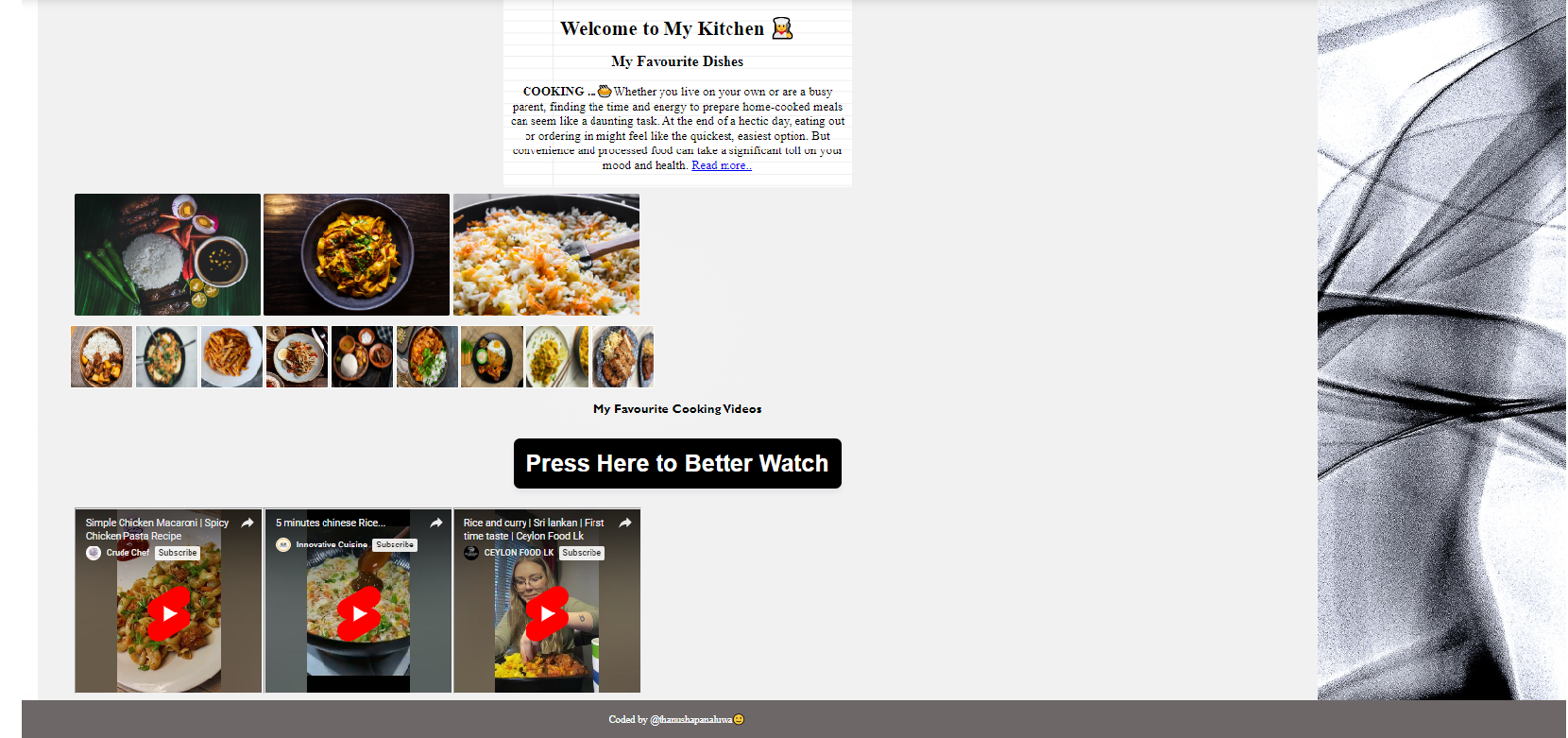 This is my first project I completed for shecodes. html, css, javascript used here.Welcome to My Kitchen🥧